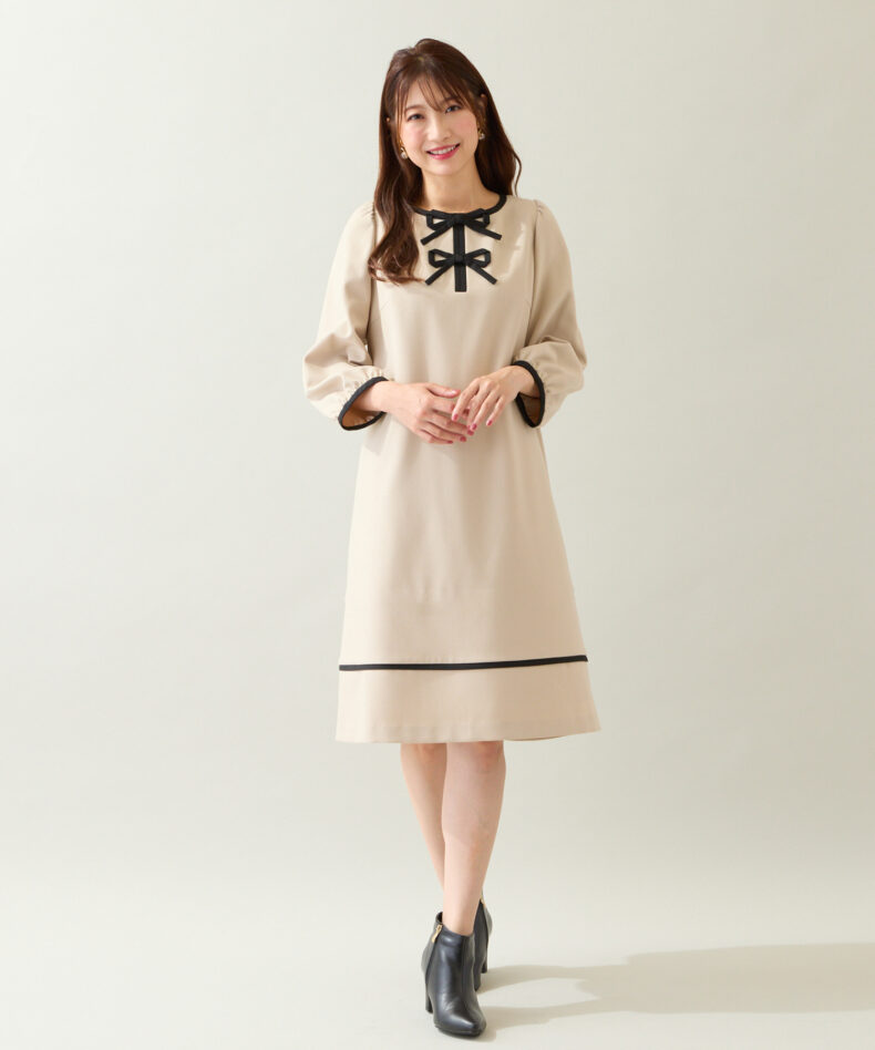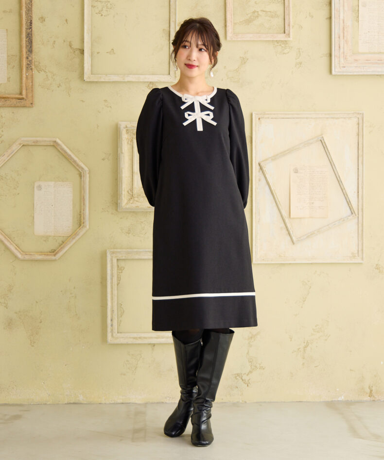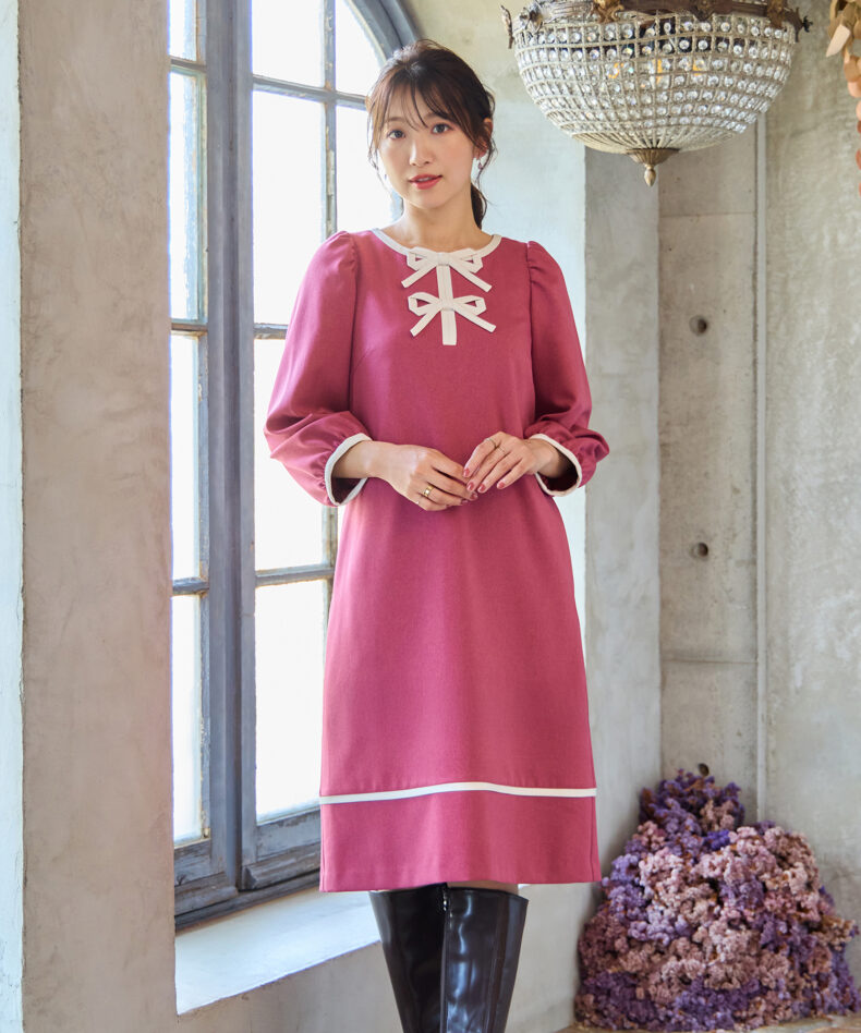胸元の配色リボンがアクセントになった、シンプルなストレートラインのワンピース。