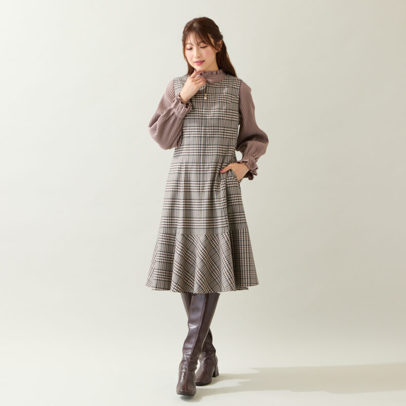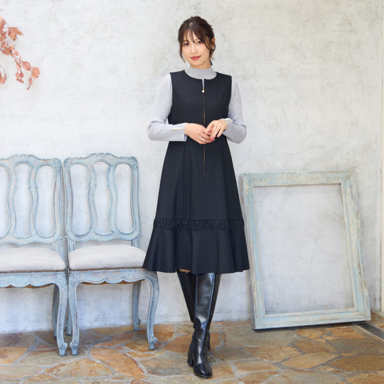 季節の深まりとともに、ニットやブラウスを重ねて楽しめるジャンパースカート。