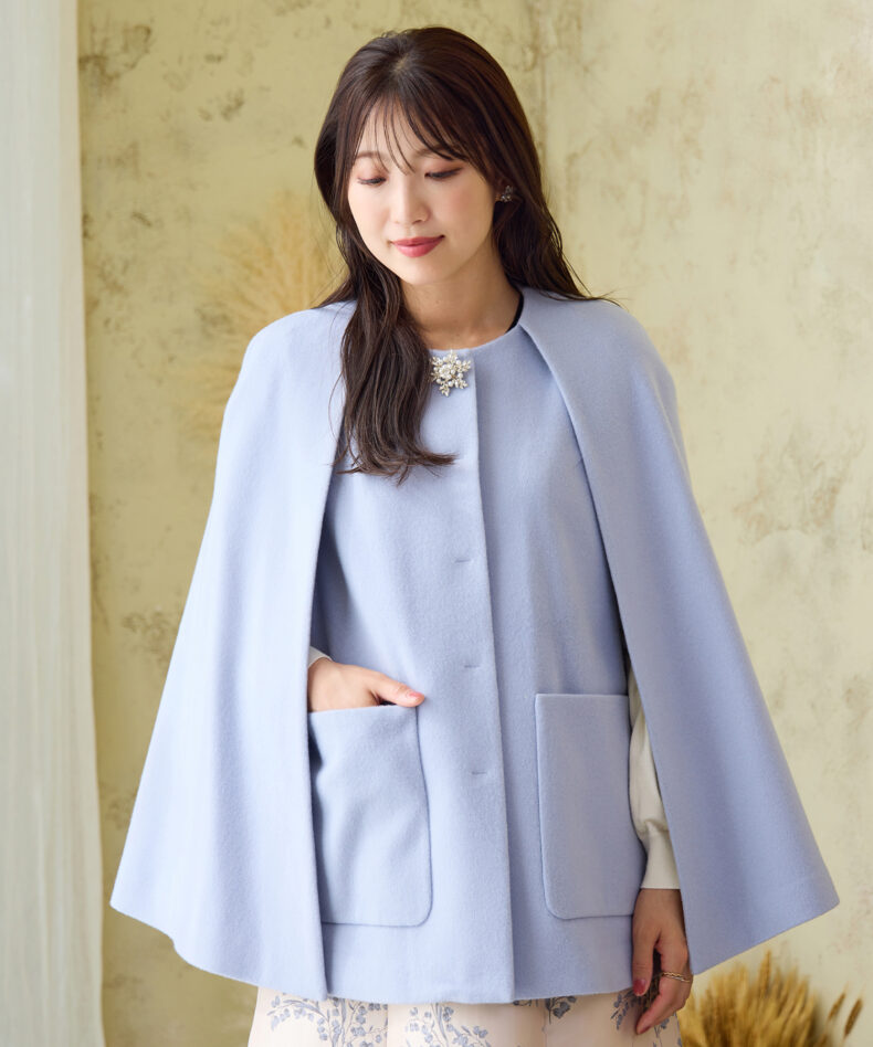 袖がケープデザインになったフェミニンなシルエットのショート丈コート。