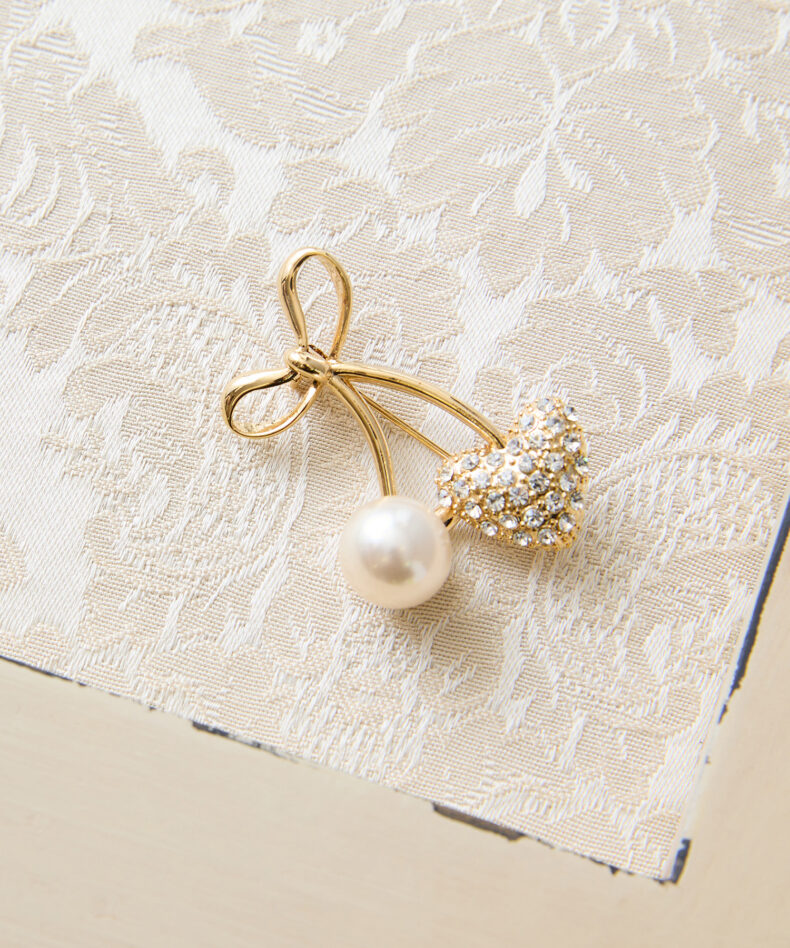 ラインストーンのハートとフェイクパールをチェリーにした上品なブローチ。
