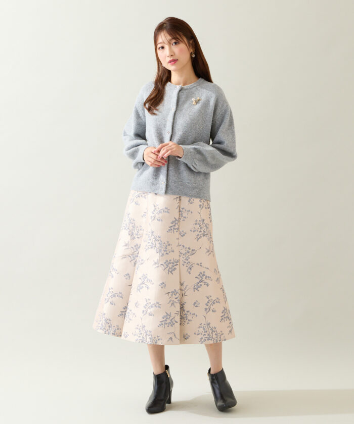 お花モチーフのスパンコールが光を受けてきらめくラメニットに、スズランジャカードのフレアスカートを合わせたホリデーシーズンにぴったりの華やかスタイル。