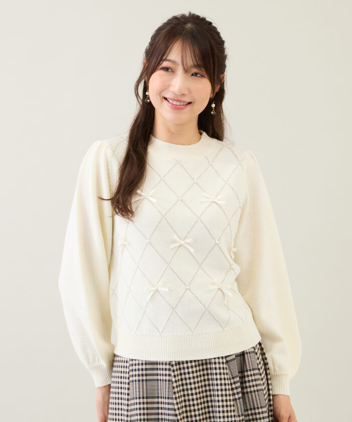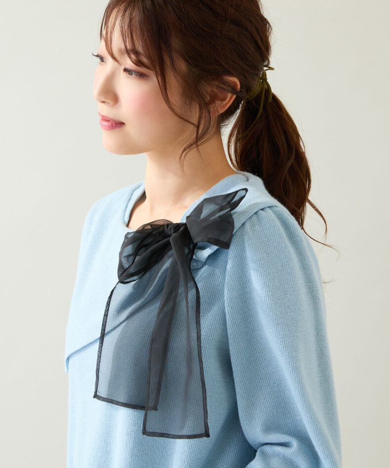 ビッグカラーに立体的なリボンモチーフをあしらい、顔まわりを明るく見せるフェミニンなデザインです。