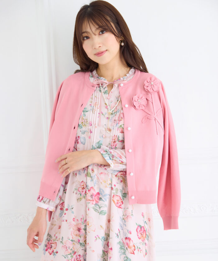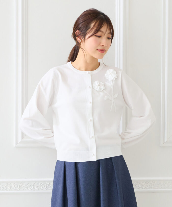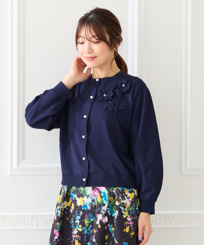 立体的なお花モチーフに、パールときらめきをそっと添えた特別なカーディガン。