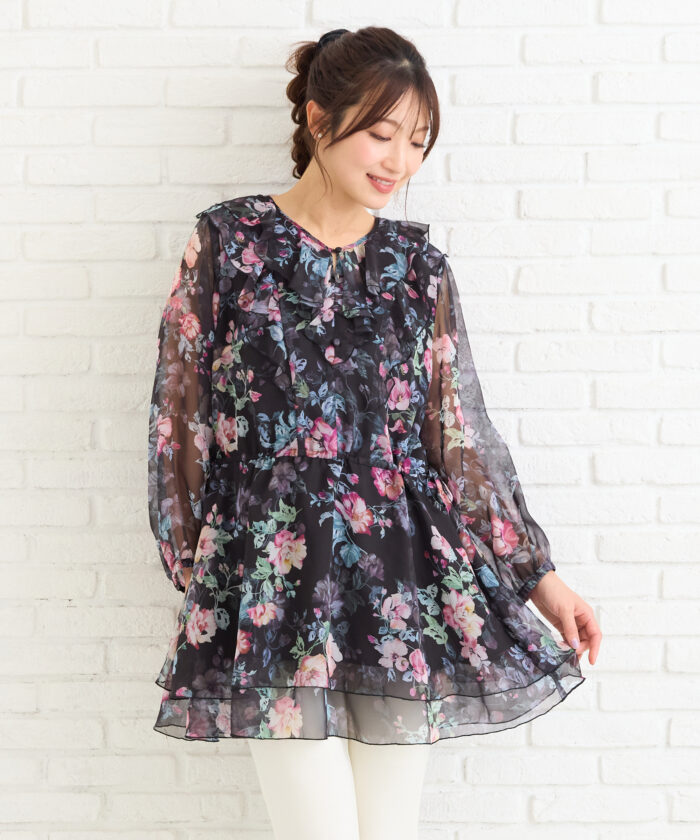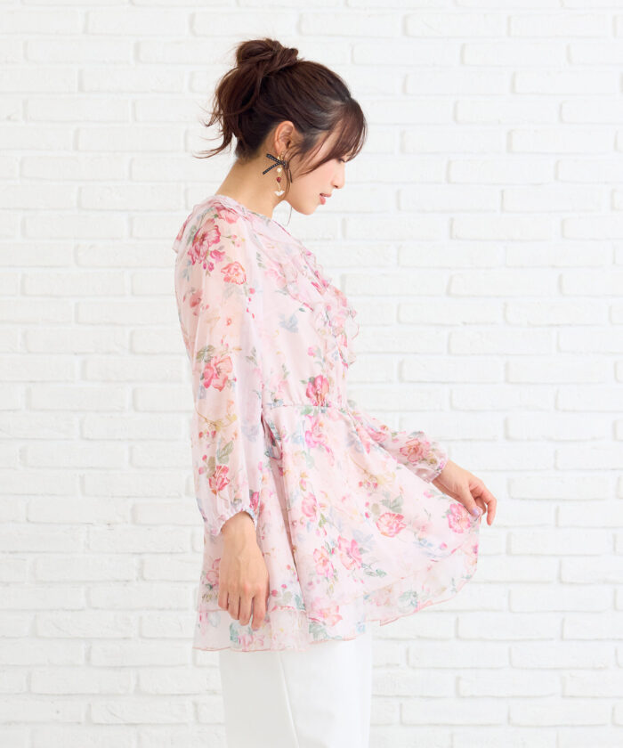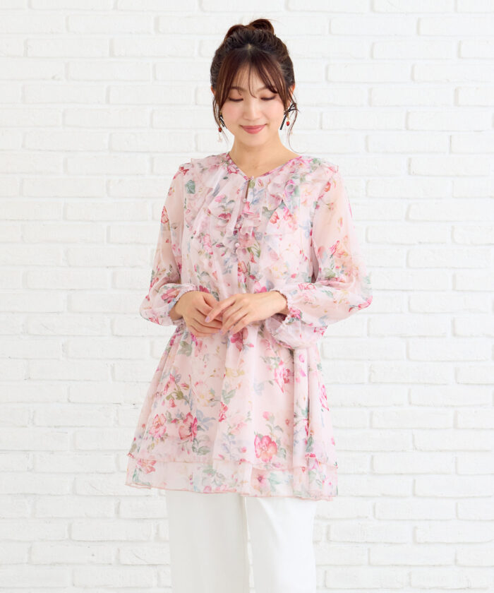 オリジナルのフラワープリントが目を惹く、華やかなチュニックブラウス。
